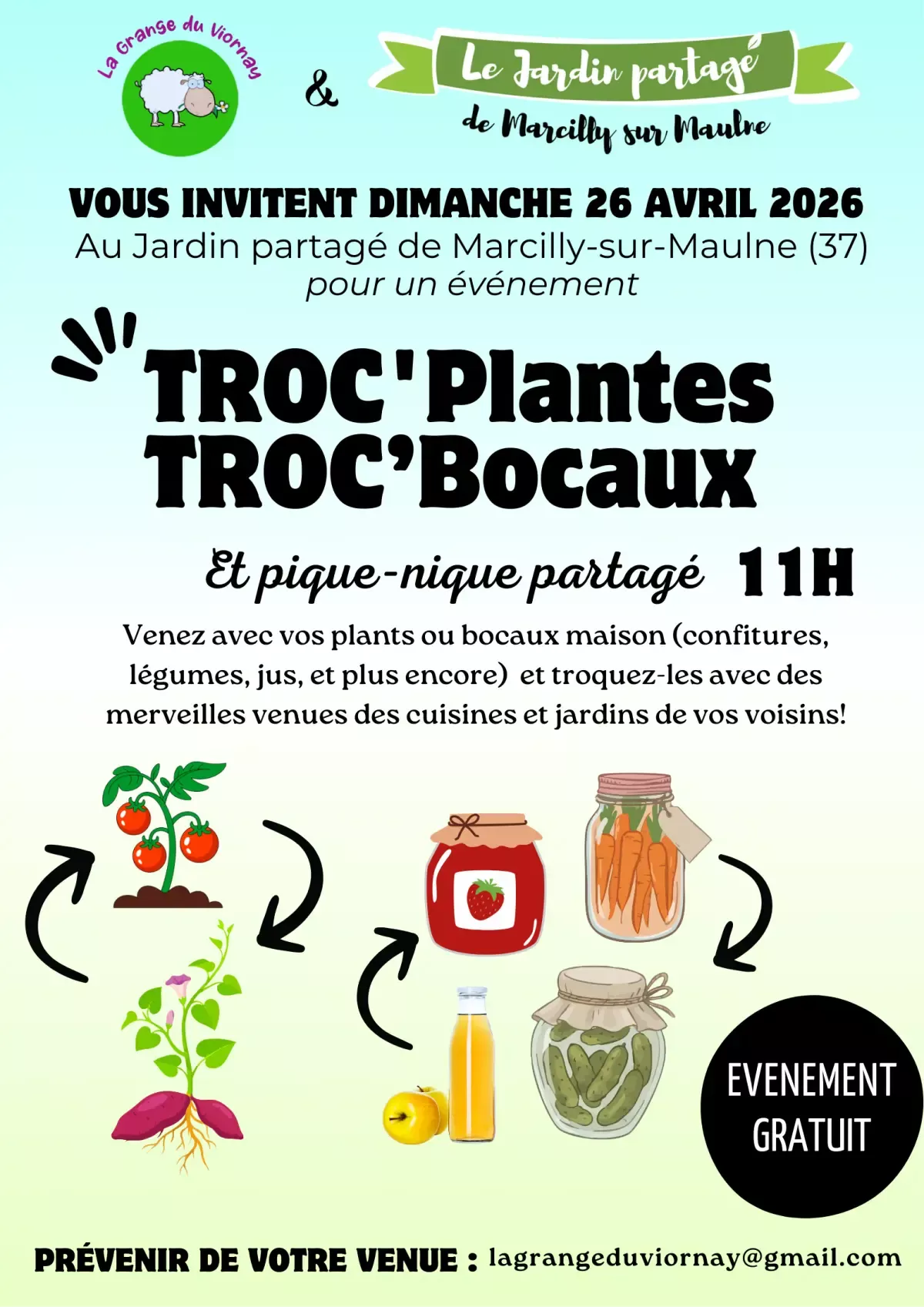 Cette année, notre Troc'bocal & Plantes du printemps sera co-organisé avec l'association du jardin partagé de Marcilly-sur-Maulne ! Alors rendez-vous à 11h au jardin (Rue des Deux Ponts) pour échanger bocaux faits maison et plants (potager, vivaces, ornementales) dans une ambiance conviviale, sans argent, autour du troc et du partage. Chacun apporte ce qu’il souhaite, et la rencontre pourra se prolonger avec un pique-nique partagé pour celles et ceux qui le veulent. Un moment simple pour découvrir, échanger et repartir avec de nouvelles idées et de quoi faire pousser la suite ! (événement gratuit et ouvert à toutes et tous).